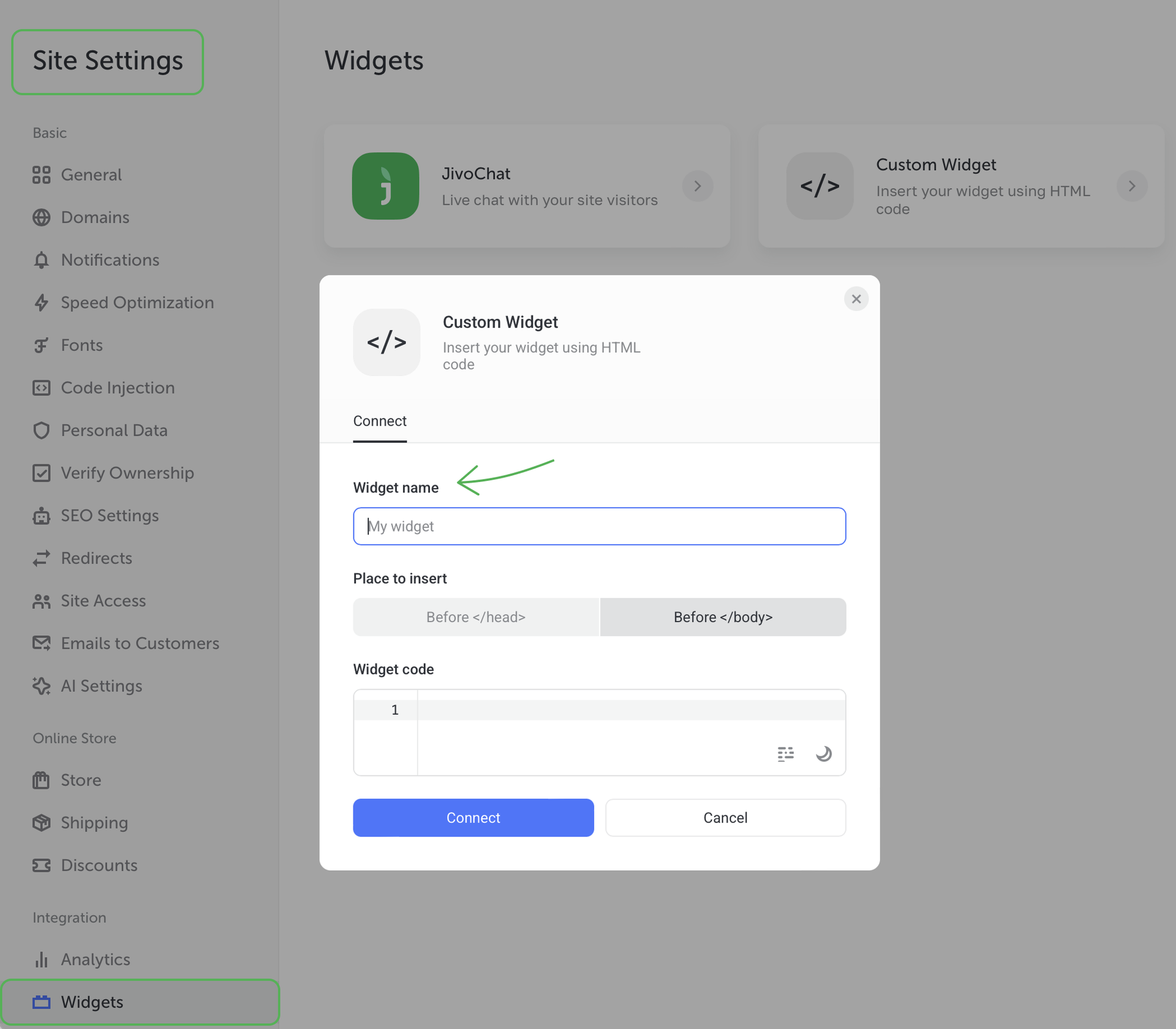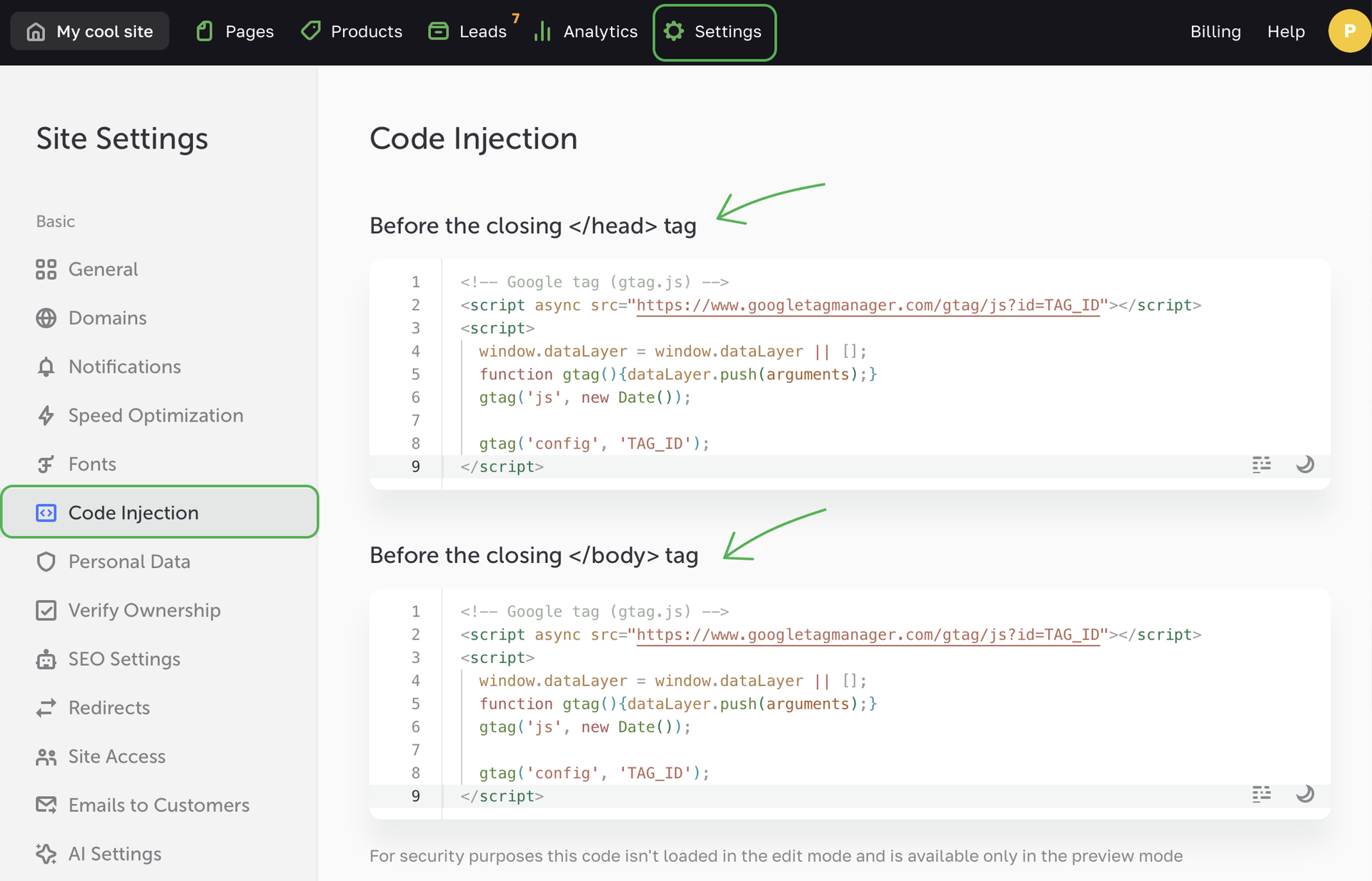 Any code you add in the Settings → Code Injection is applied to all pages of your site. It's the simplest, low-level way to embed code. It is suitable for embedding counters, widgets, and tweaks that should apply to site-wide. The run any custom code, go to the Preview mode.