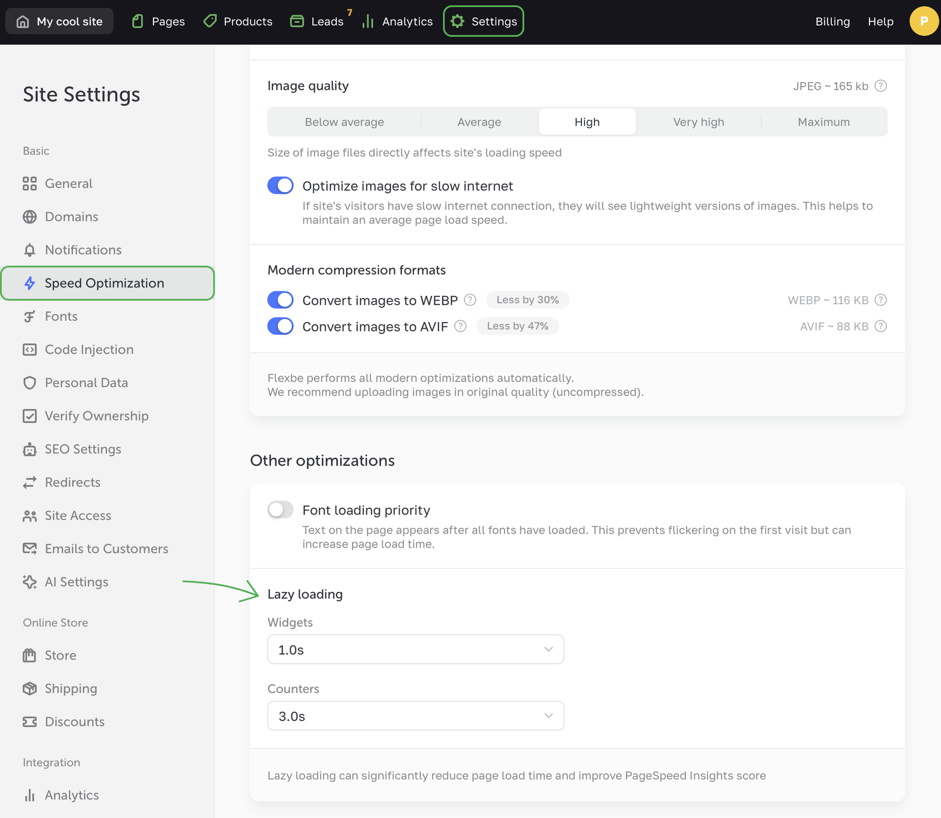 To set up lazy loading of a widget, go to the Settings -> Speed Optimization and set the time of delayed loading.