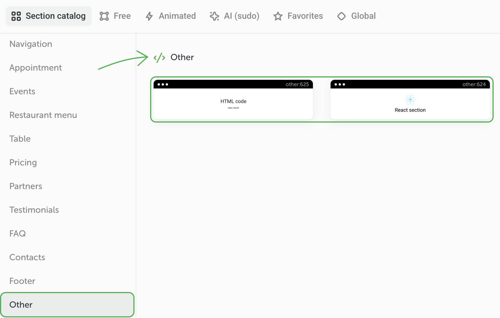 HTML blocks (sections, pop-ups and elements) also run on particular pages. They are suitable for embedding code that should run in a specific place on the page (for example, a calculator widget). Injecting code through HTML blocks also comes in handy for adding CSS styles to your custom classes of elements and iframes.