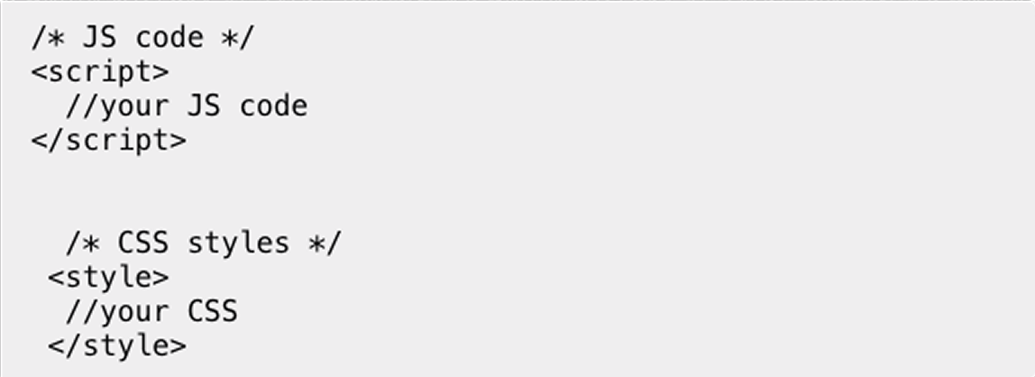You can inject JavaScript and CSS code in two separate tabs so there's no need to wrap code snippets with tags. The JS tab supports ES Modules. The CSS tab supports LESS syntax. Using the CSS tab, you can also set up the responsive mode for mobile devices without additional need to manage @media.