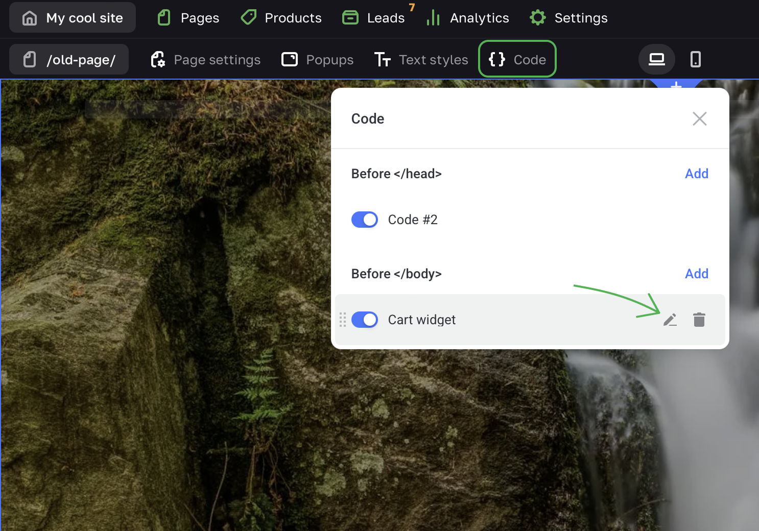 Any code you embed on the Code tab of the upper panel applies to a current page only. It allows you to add widgets conveniently without stacking them in the window of the Code Injection.