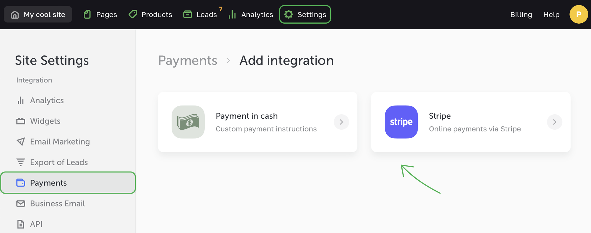 - 9 8. Go to your site's Settings -> Payments, click Add integration and choose Stripe. In the open window, paste the copied keys (Publishable key, Secret key and Signing secret) to the appropriate fields. Then click Save.