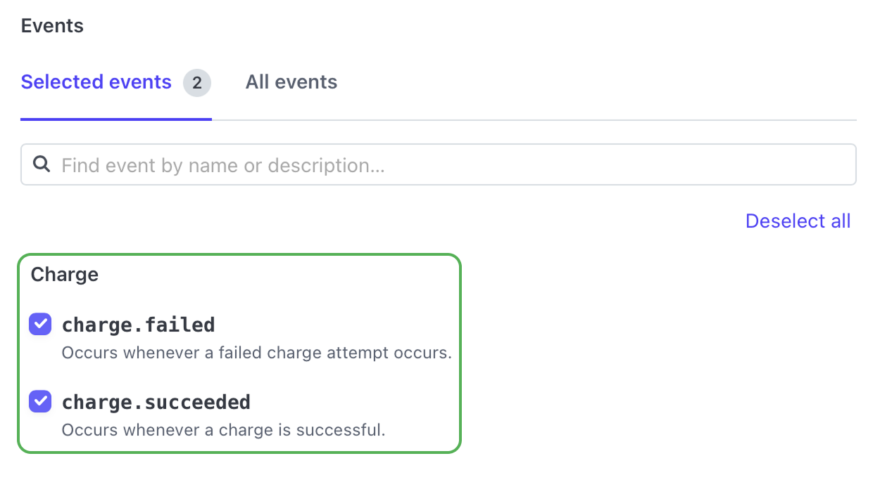 - 6 In the list of events, choose charge.failed and charge.succeeded.
