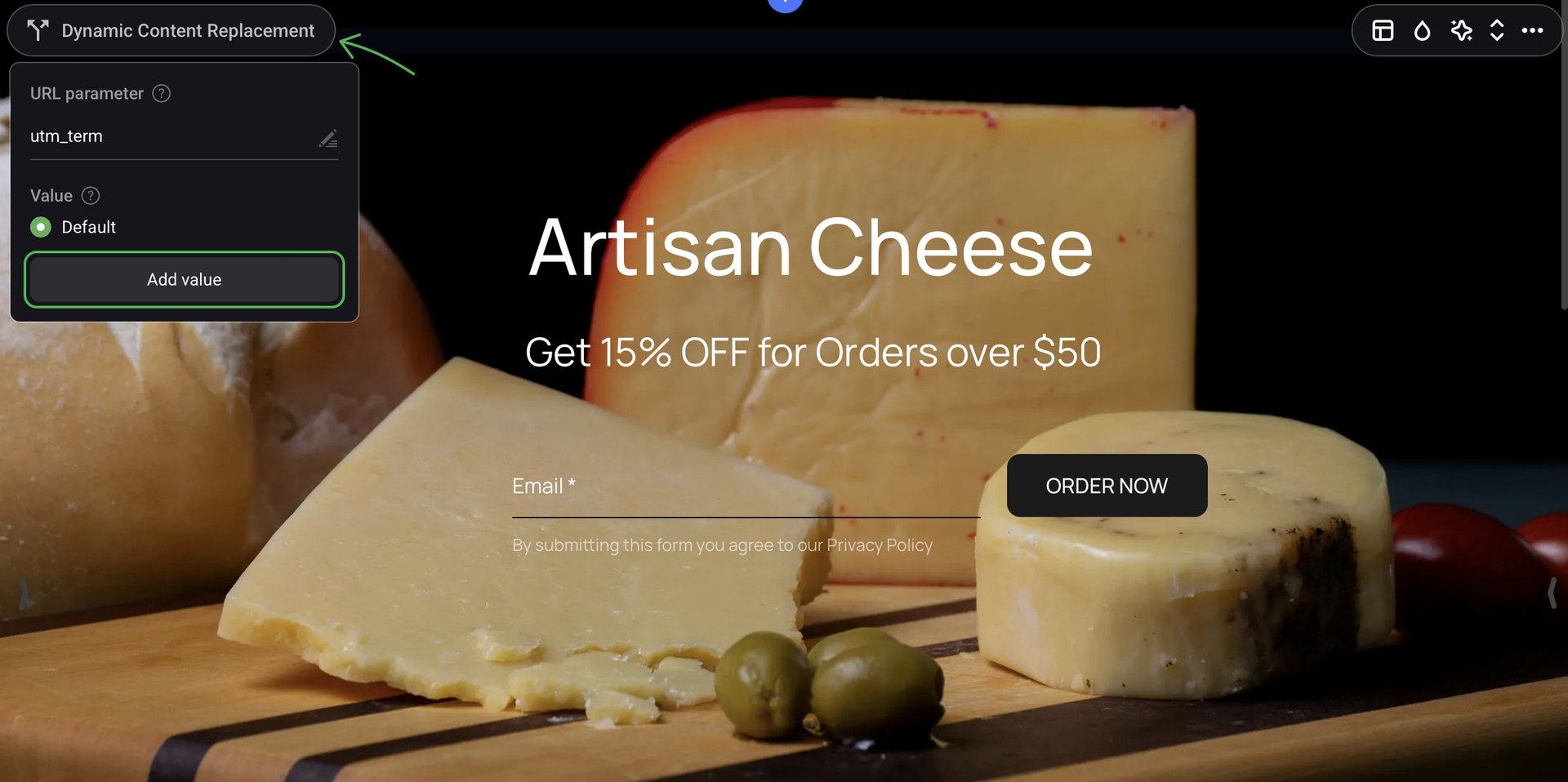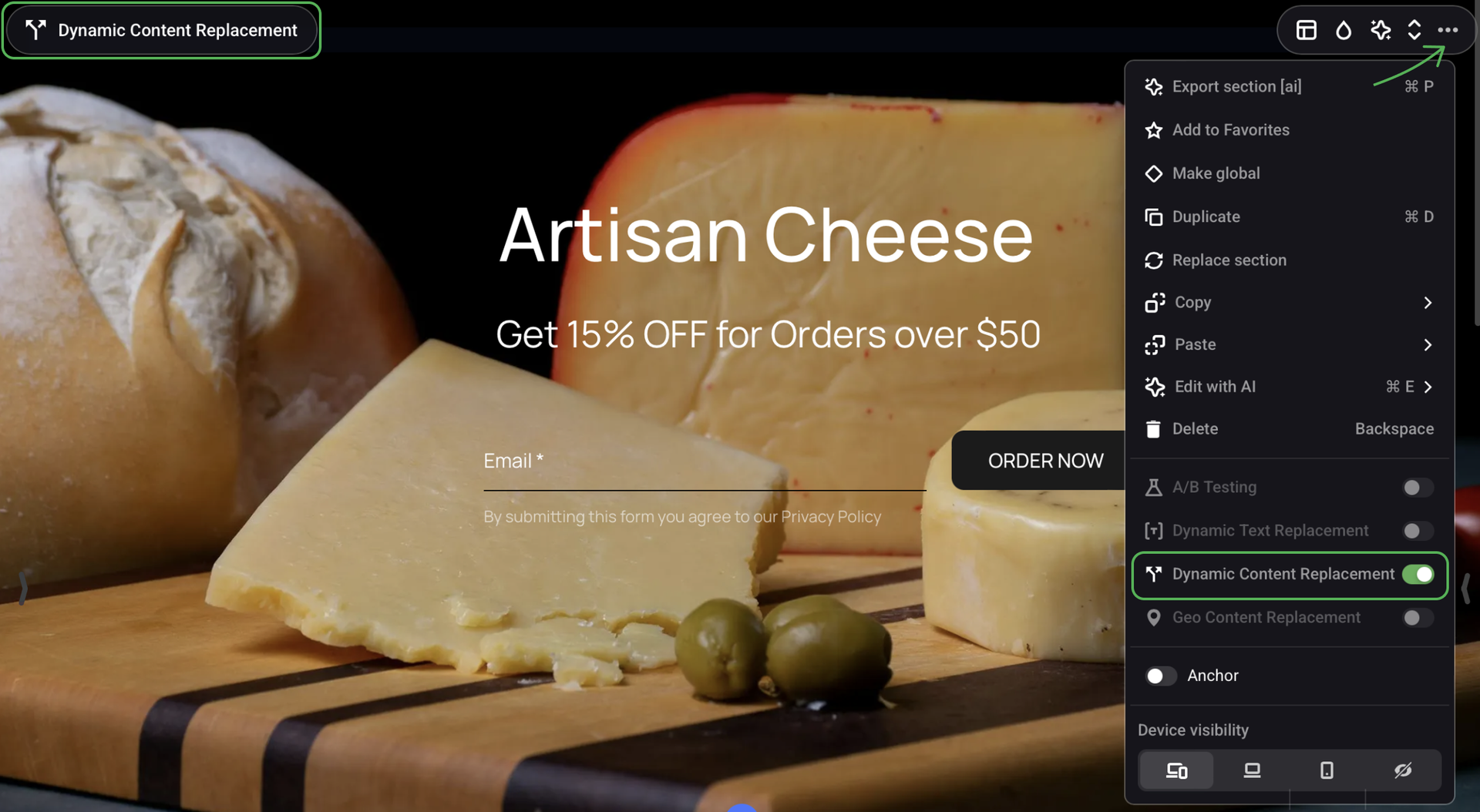 To enable DСК, click the “…” icon in the section settings and switch on the toggle. The Dynamic content replacement icon appears in the top left section corner.