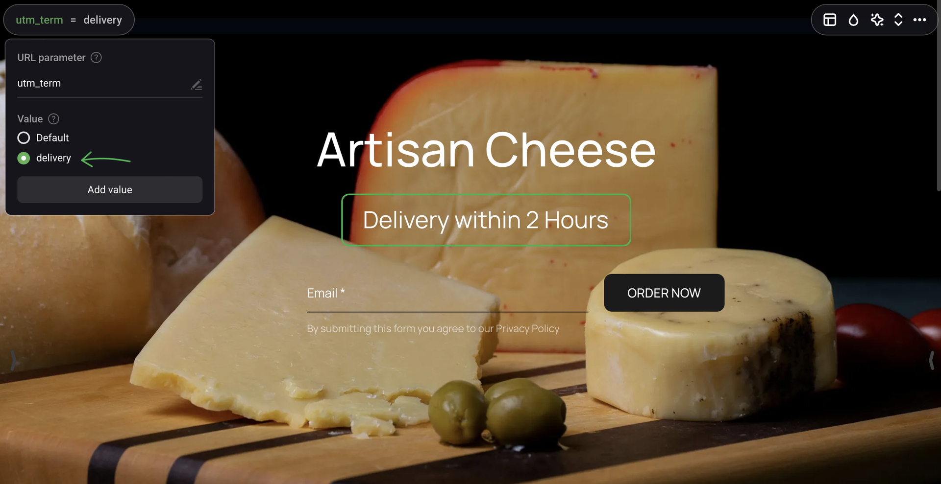 To add the second version of the section, click Add value and name it, for example, delivery. This word will be added to the main link: cheeze.com/?utm_term=delivery.