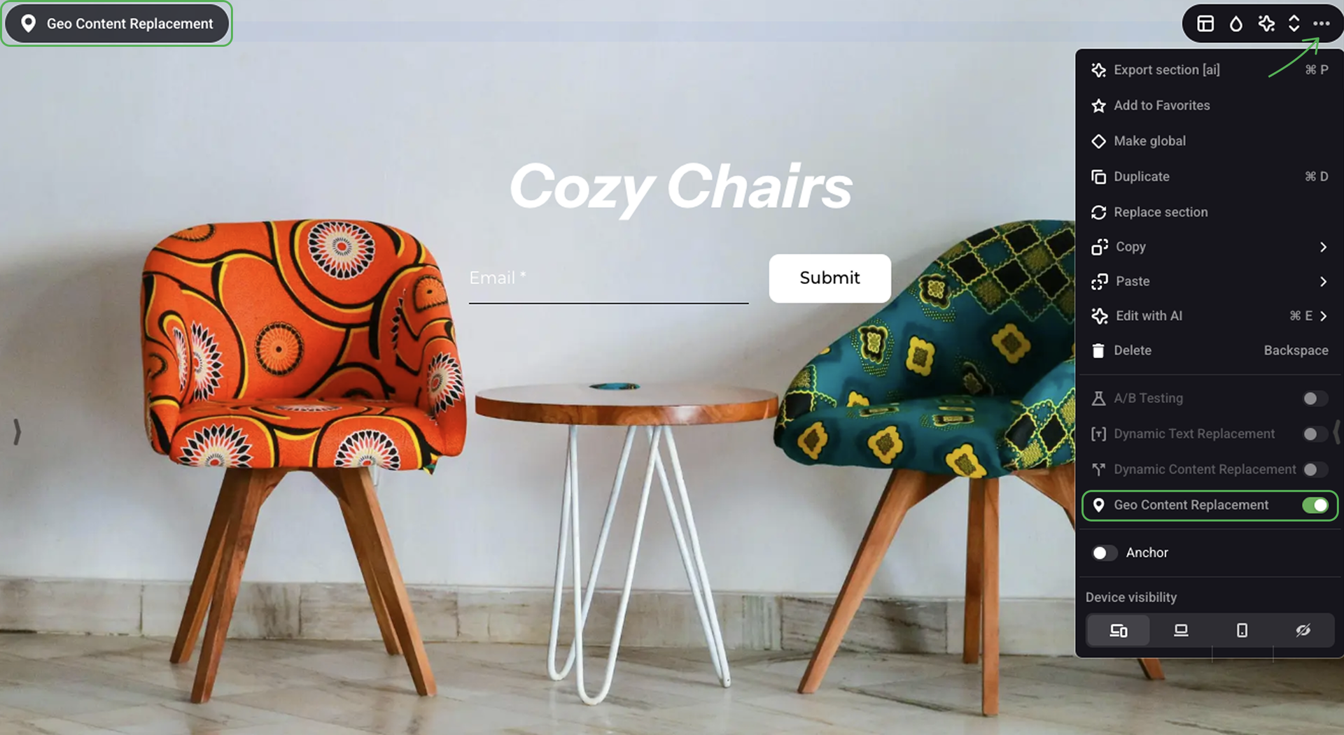To enable GCR, click the “…” icon in the section settings and switch on the toggle. The Geo content replacement icon appears in the top left section corner.