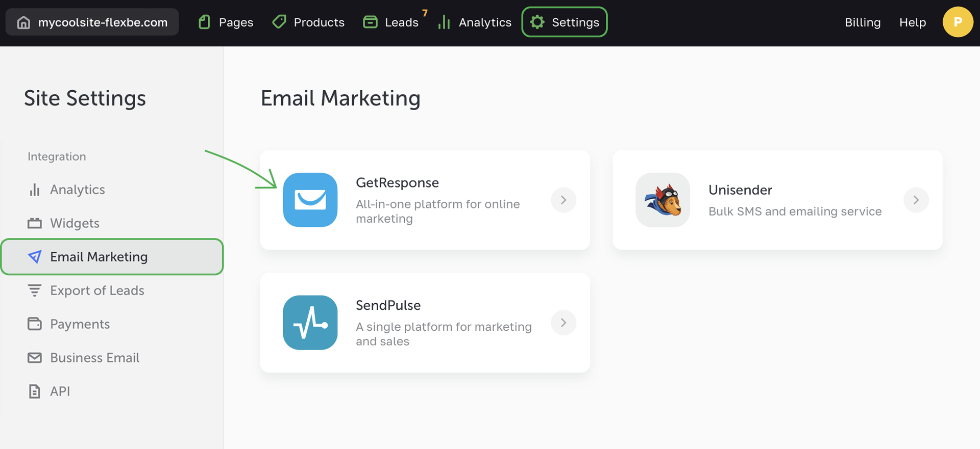 Now select a contact list and click Apply. You can also create a new list on Flexbe, it will automatically appear in your GetResponse account.