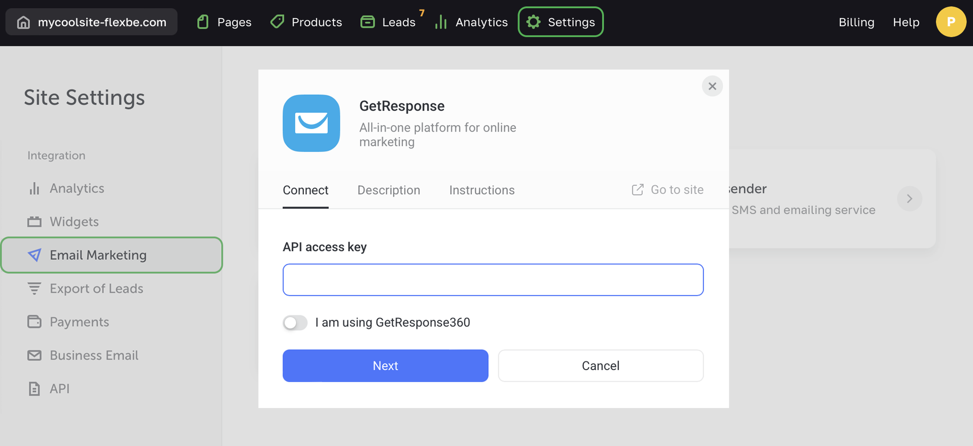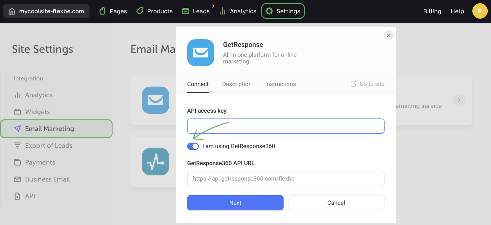 If you are on the Enterprise plan, then copy your API key to the GetResponse360 API URL field and click Next.