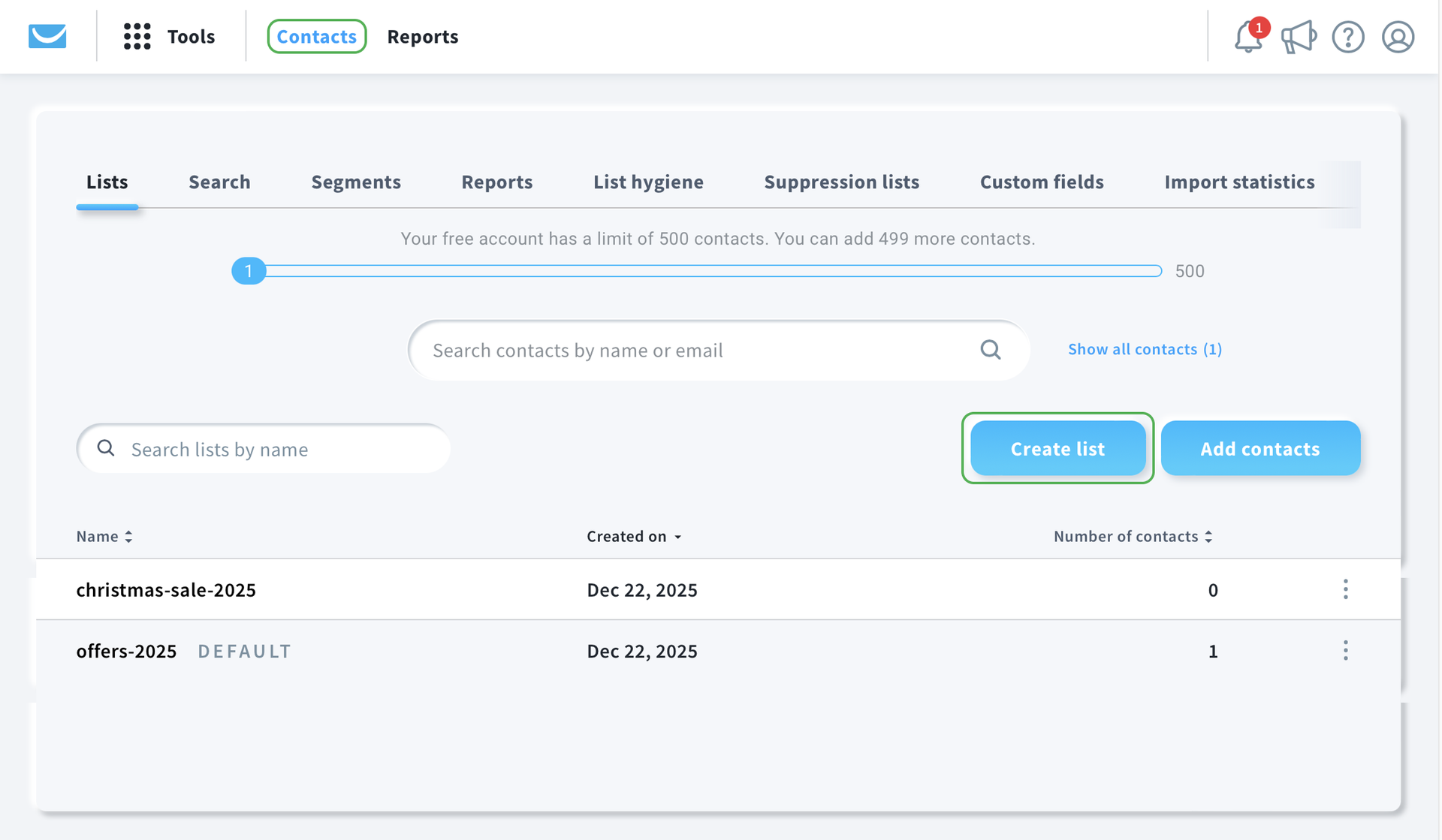 To create a new list in GetResponse, go to the Contacts panel and choose the Lists tab.