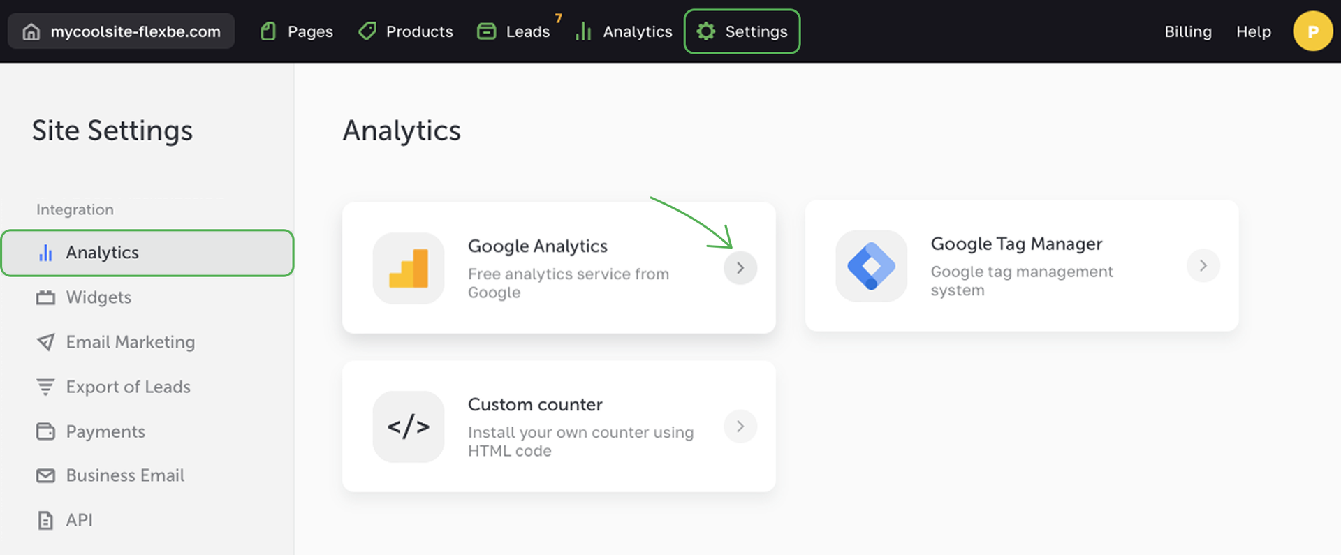 To connect GA4, go to Settings → Analytics and choose Google Analytics.