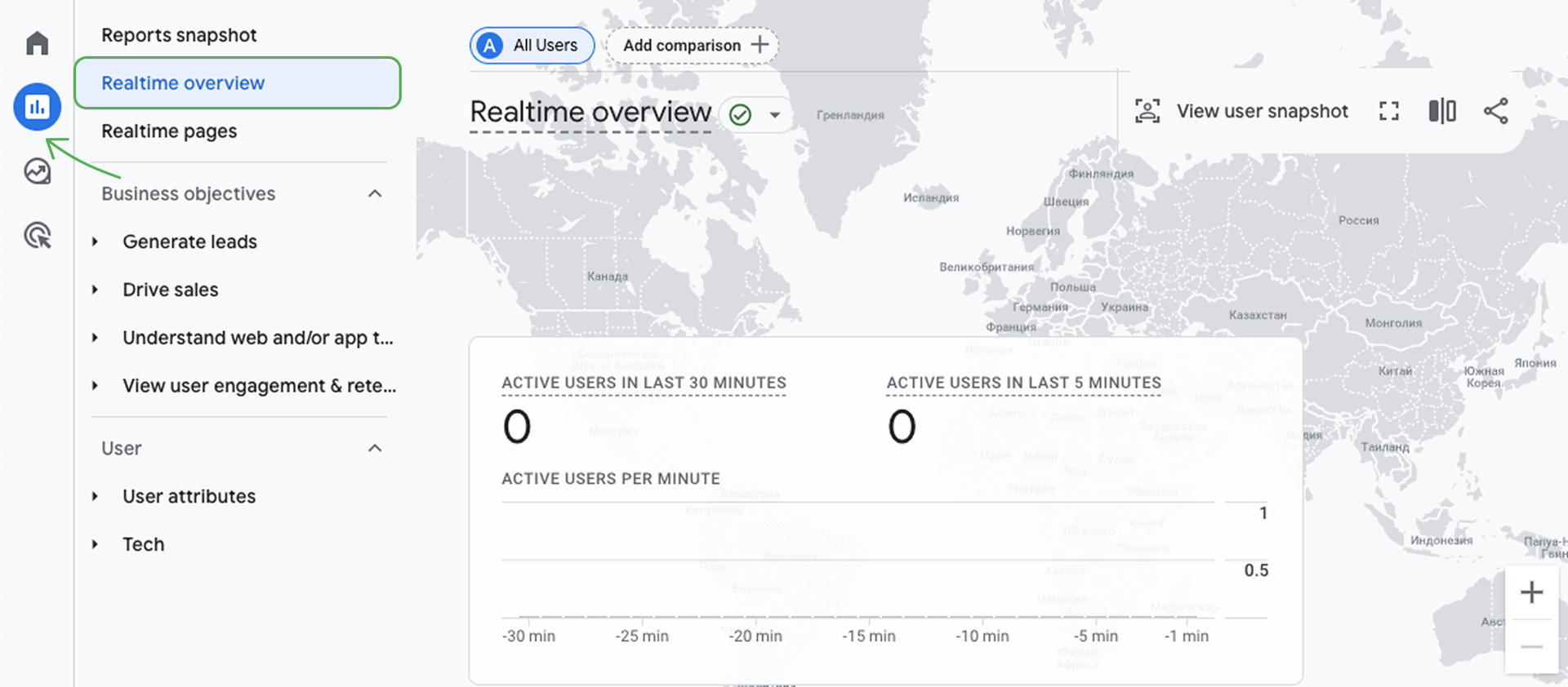 We recommend using the Realtime reports tab as your starting point as it provides the freshest information about what is happening on your site.