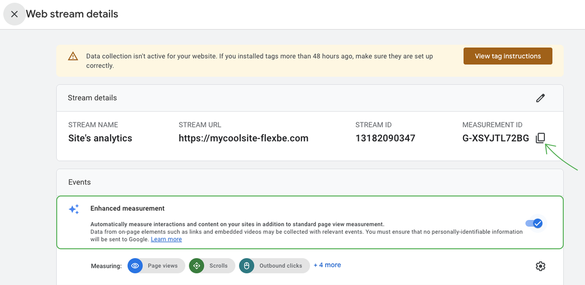 In the stream details menu, copy the Measurement ID as you will need it to connect GA4 to you Flexbe website.