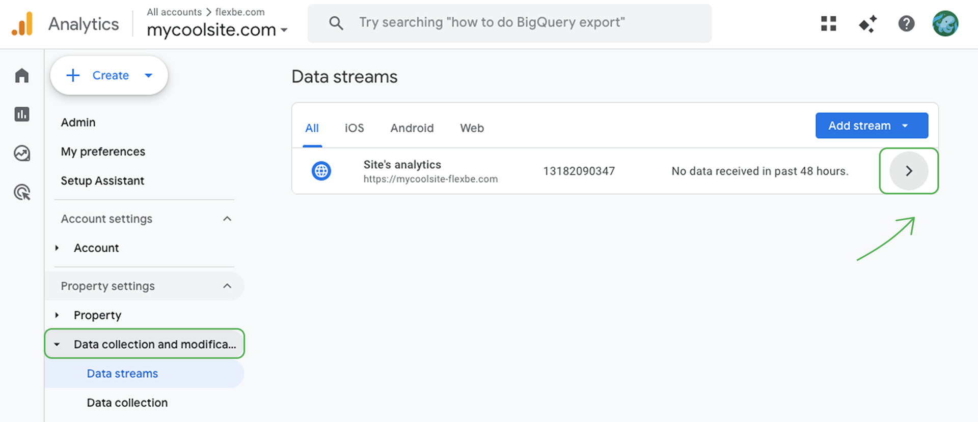 The second step is to add the Google tag snippet to your site. To do this, go to the Admin tab of GA4, open Data collection and modification -> Data streams and click the arrow in the property card.