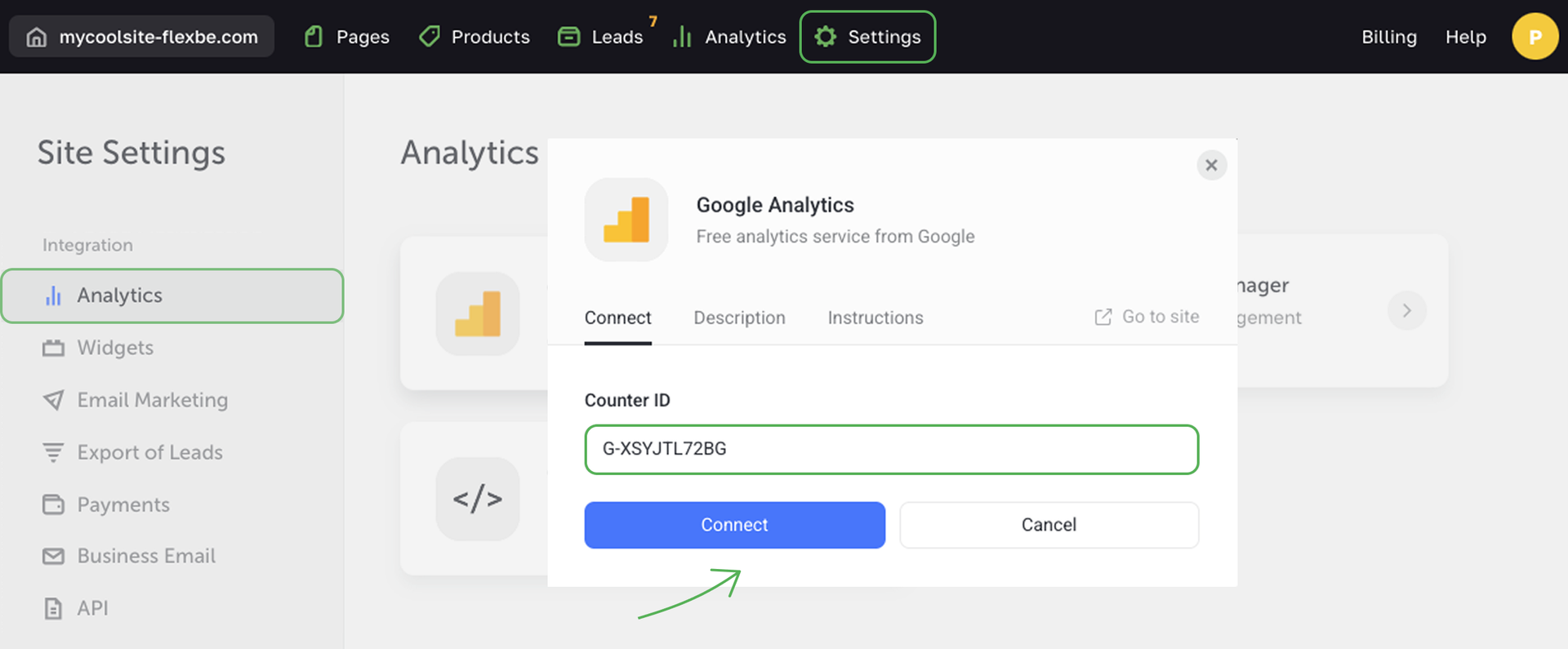 In the integration window, paste the copied ID into the Counter ID field and click Connect.