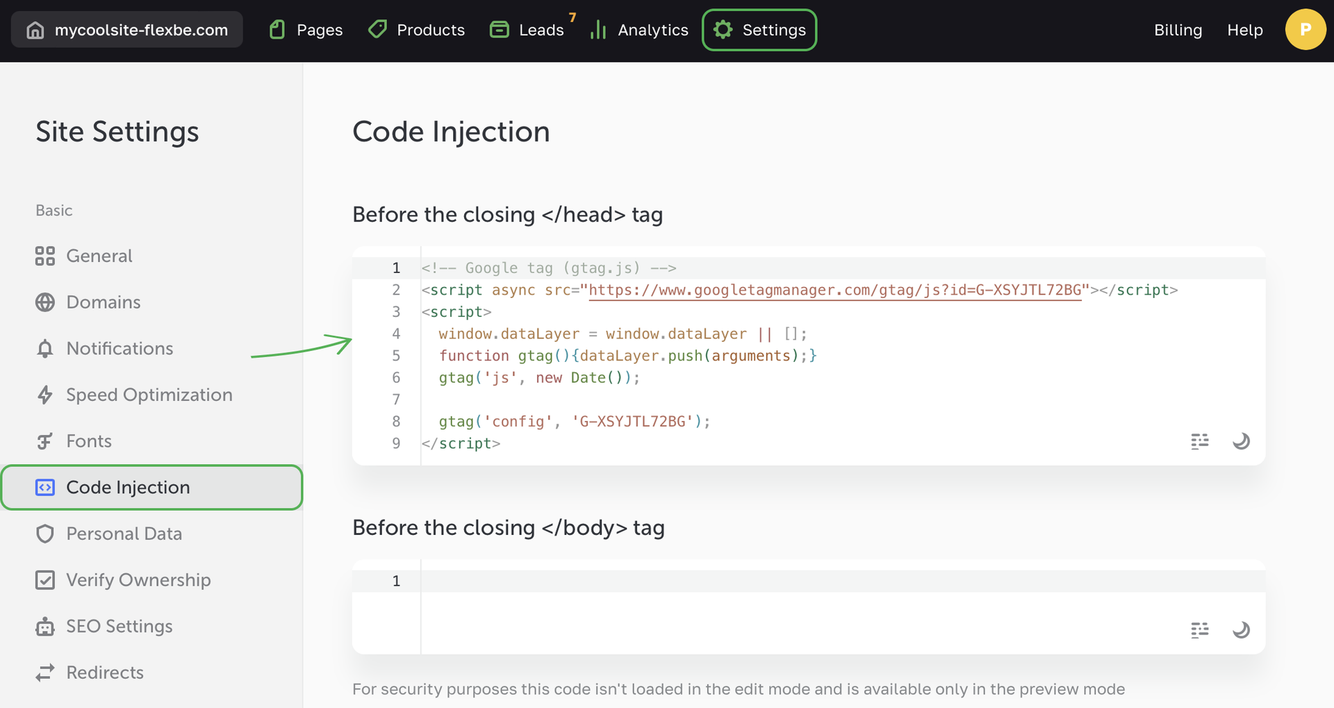 Here copy the Google tag snippet and paste it to Settings -> Code Injection as described. Here you can also test the installation.