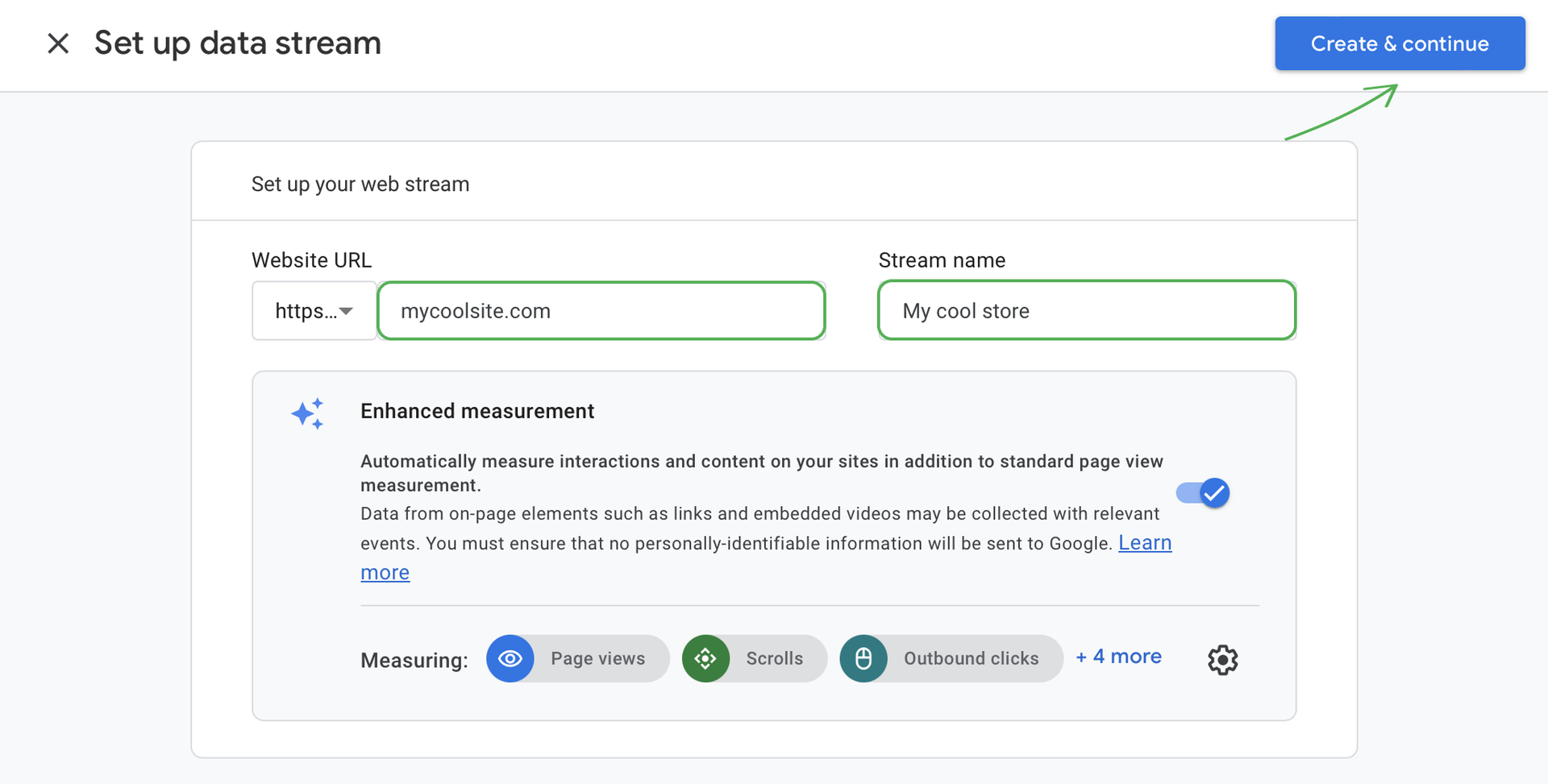 By default, the Enhanced measurement toggle is switched on to collect data on page views and interactions with the site's content.
