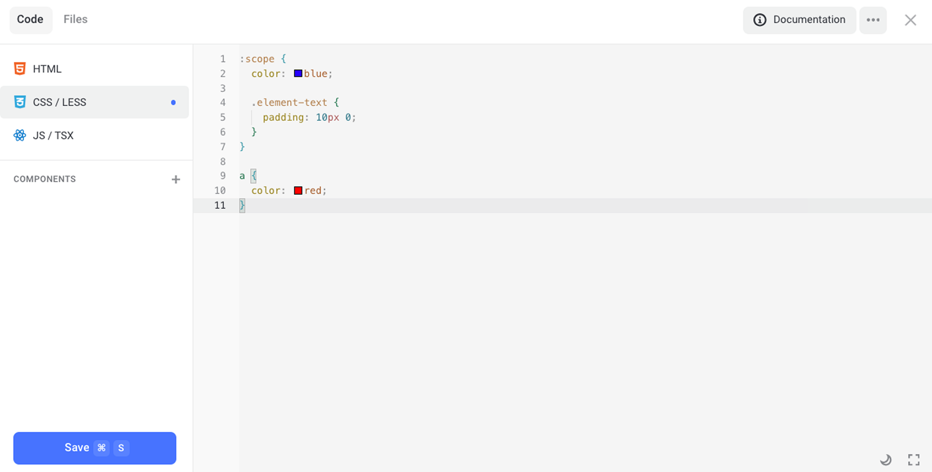 LESS pre-processing language is used in the CSS tab. Here you can add any features described in the documentation on LESS.