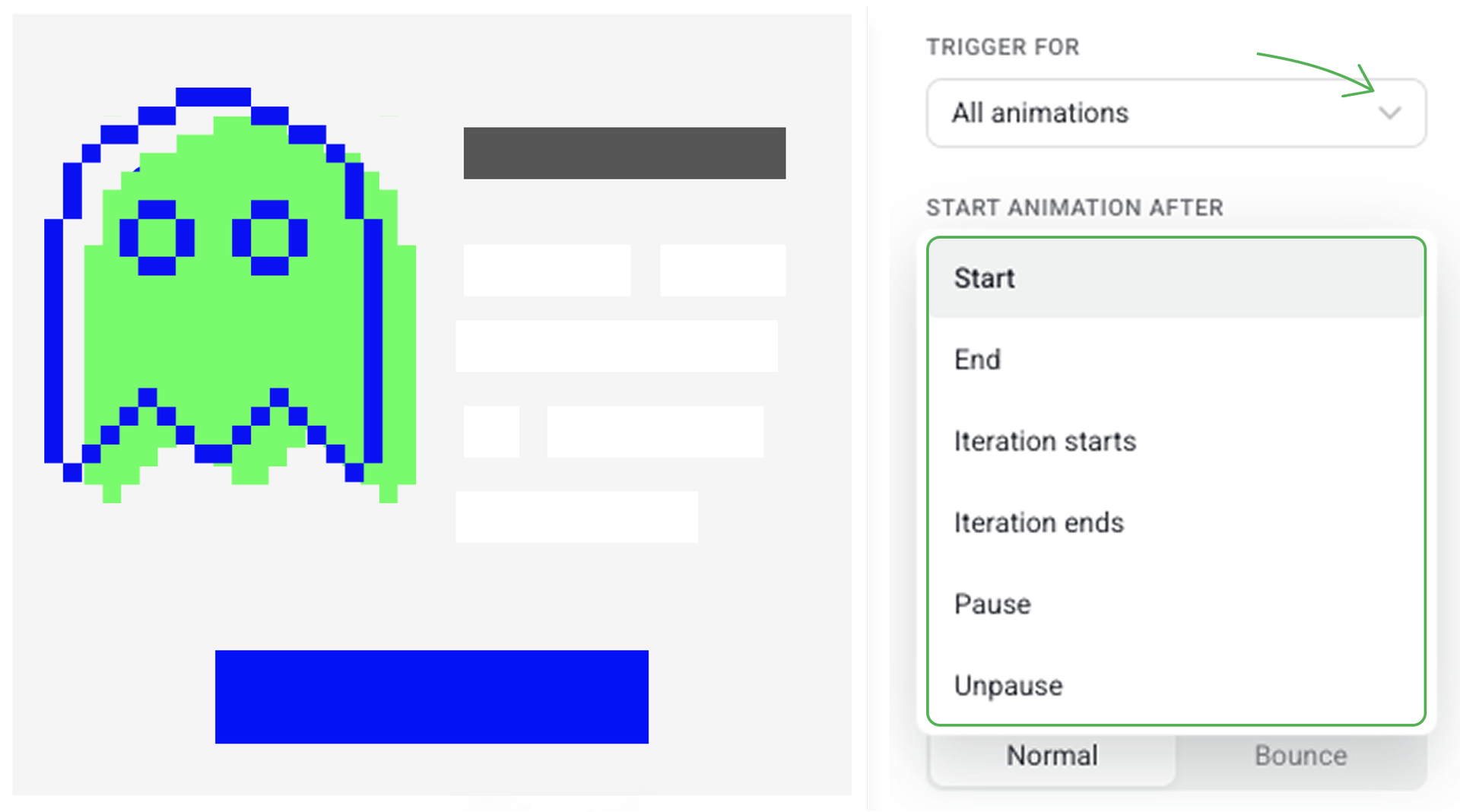 Now we need to choose at what step to start animation of the ghost. In our case, we set Trigger for all animation.