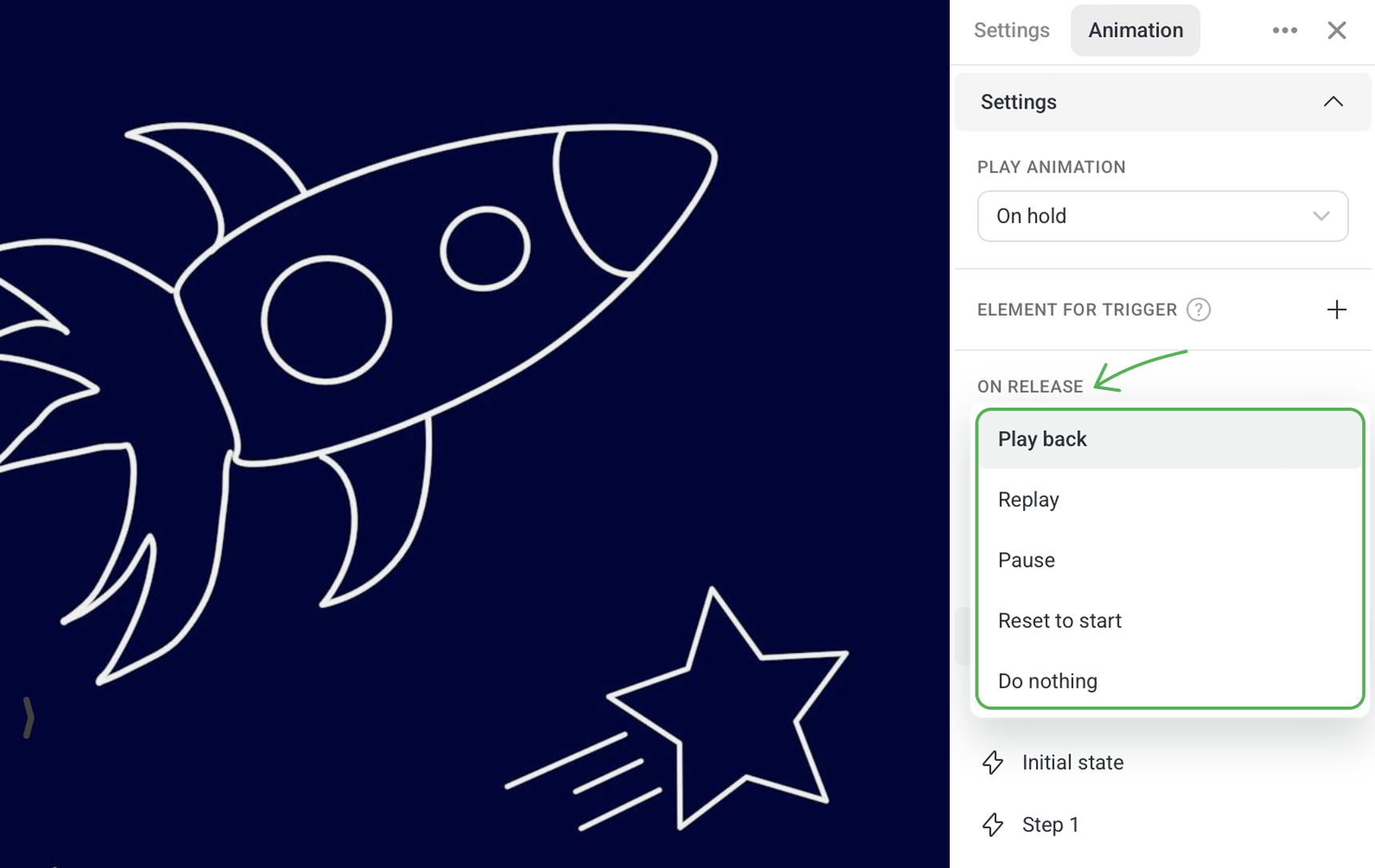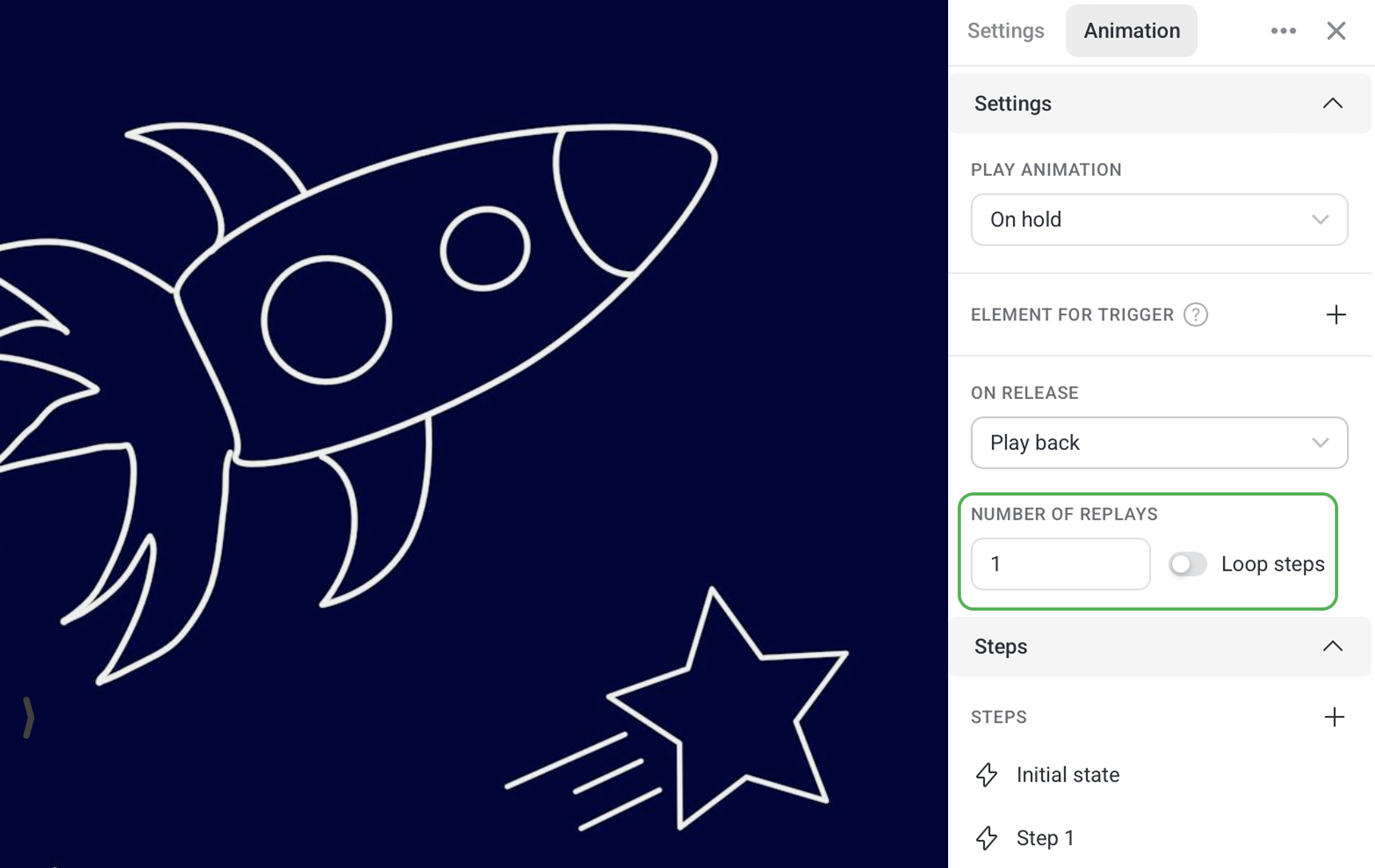 By default, any animation plays only once. You can also set up several replays or loop the steps.