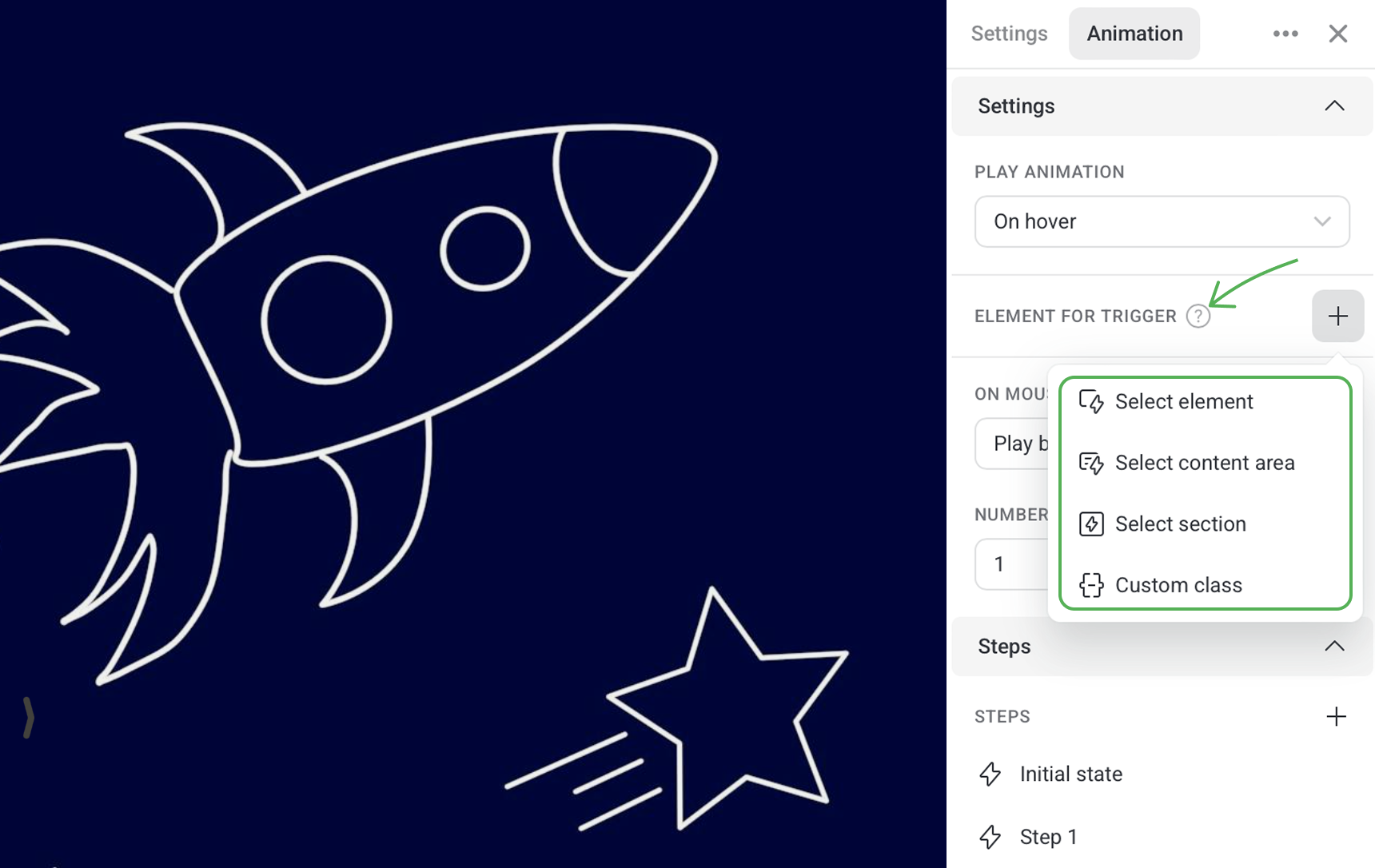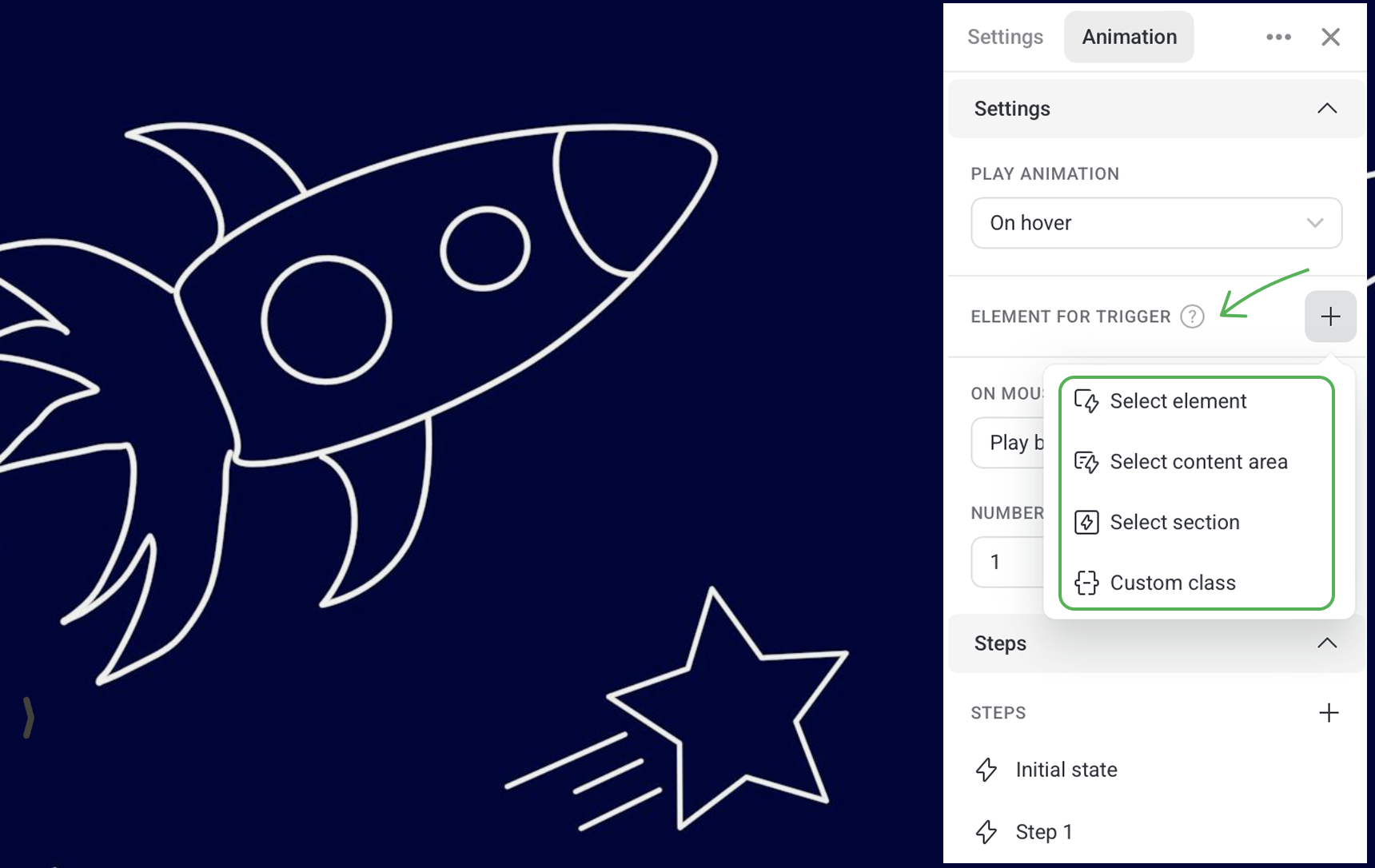 A trigger is an element that starts playing animation when a certain event happens to it. For example, a visitor clicks on / hovers over it, or when it enters the viewport on pagescroll, etc.