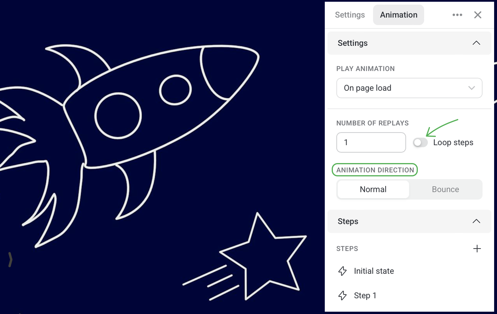 You can also set to replay animation several times or an infinite number of times by looping its steps.
