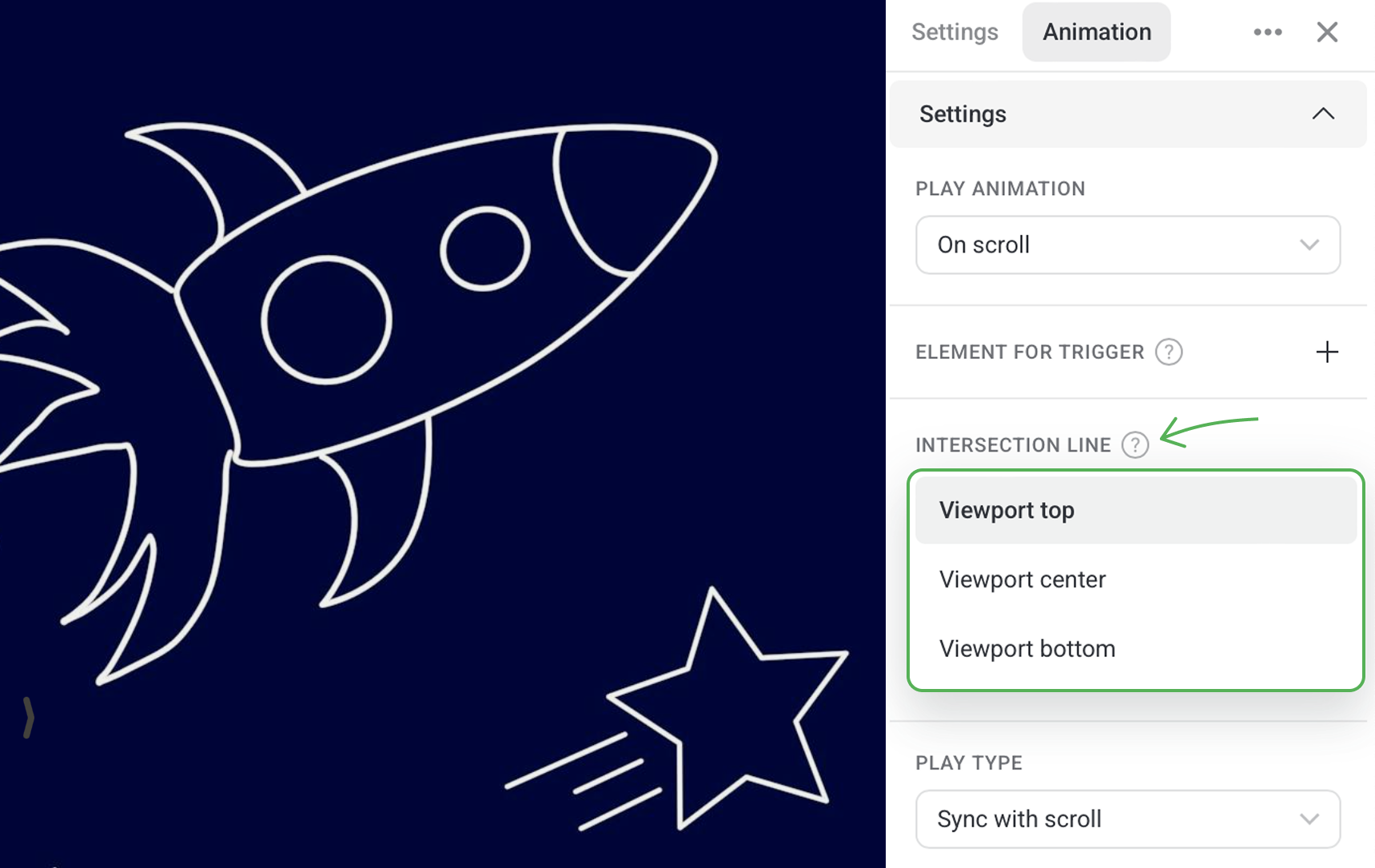 The top border, center or bottom border of the viewport can serve as an intersection line. When a trigger element crosses the set intersection line with its top, your animation starts playing.
