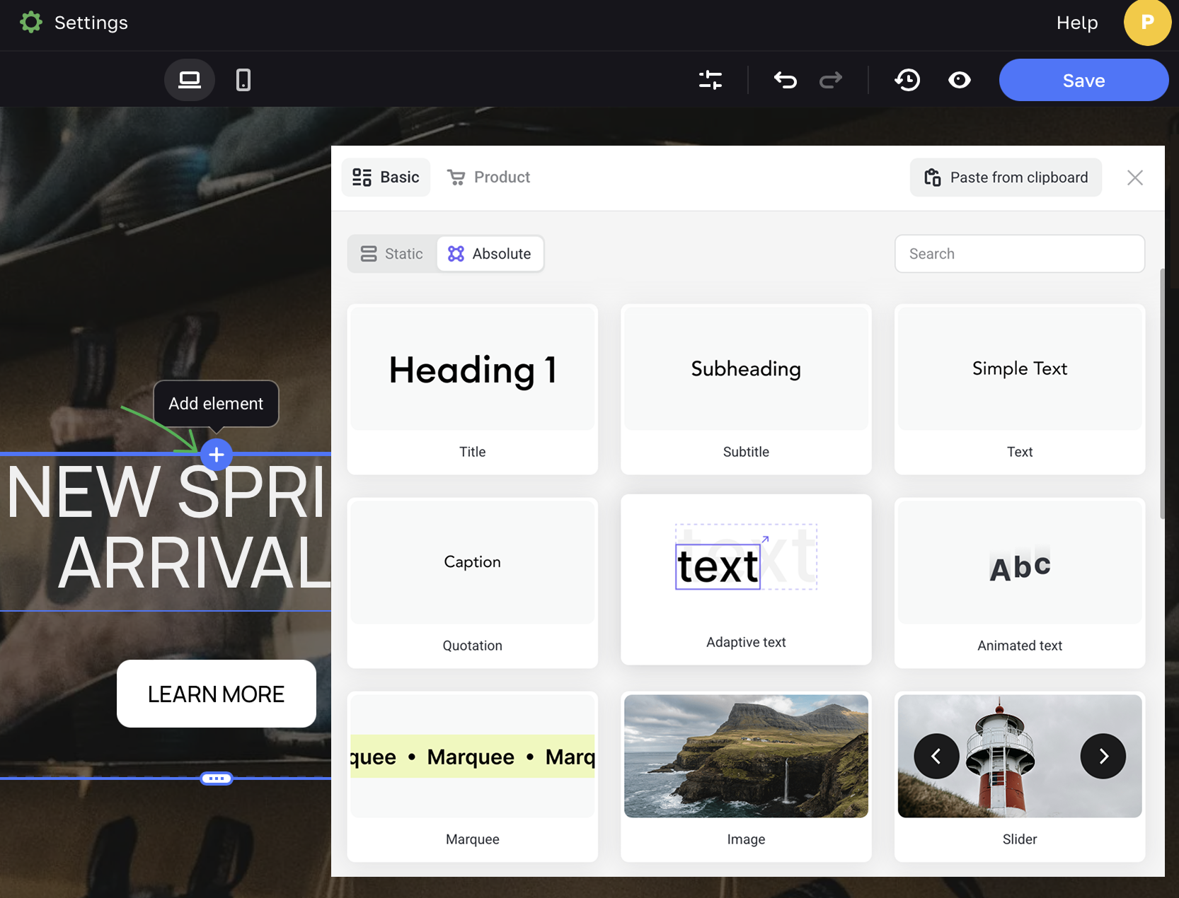 To add a new text element, click any blue icon in the section. Then choose a suitable element type and add it to the section area.