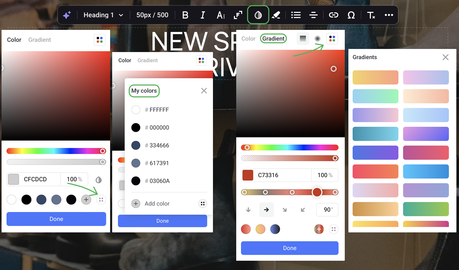 To highlight any text, select it and choose Fill color. Here you can also set the gradient of filling using the same settings as for the text color.