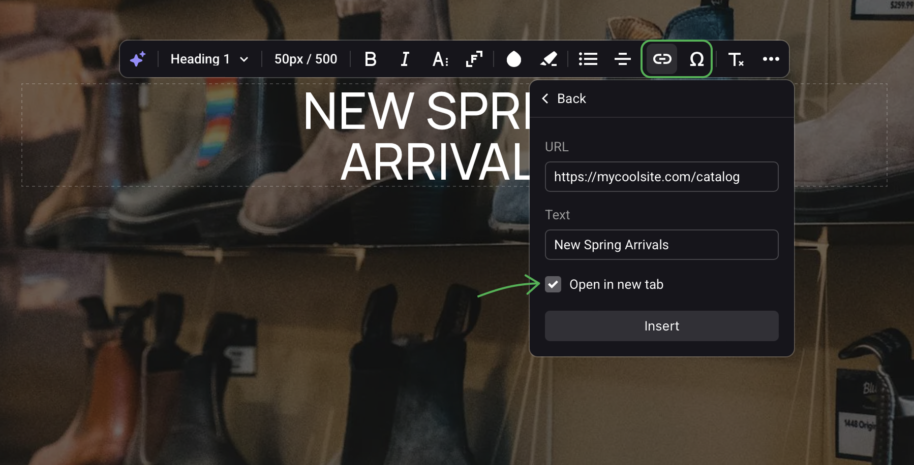 To insert a link into the text, select the required word(s) and click the chain icon. By default the link opens in the same window, but you can check the box Open in new tab.